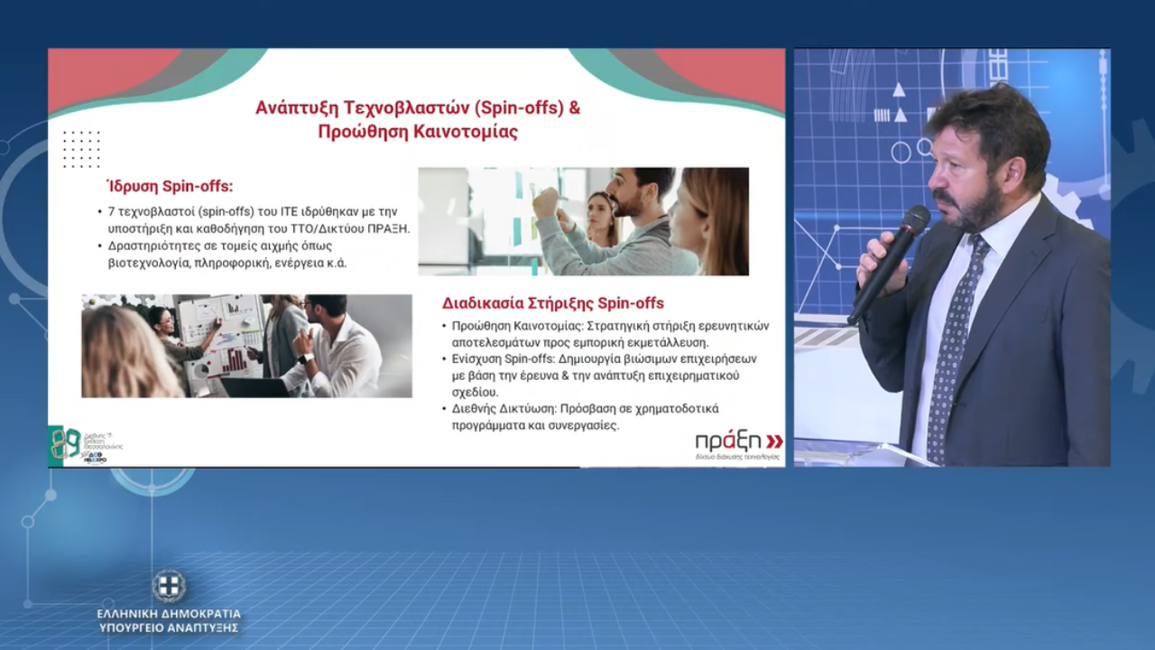 Dr. Kostas Vavekis, Head of the PRAXI Network, presented the role of spin-offs as mechanisms for research exploitation, highlighting both the challenges and the best practices that can lead to sustainable business growth.