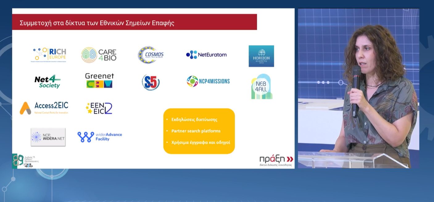 Vaya Piteli, Technology Transfer Consultant, presented the role of PRAXI Network as a National Contact Point for Horizon Europe, the specialized services it offers to the research community, and success stories of support.