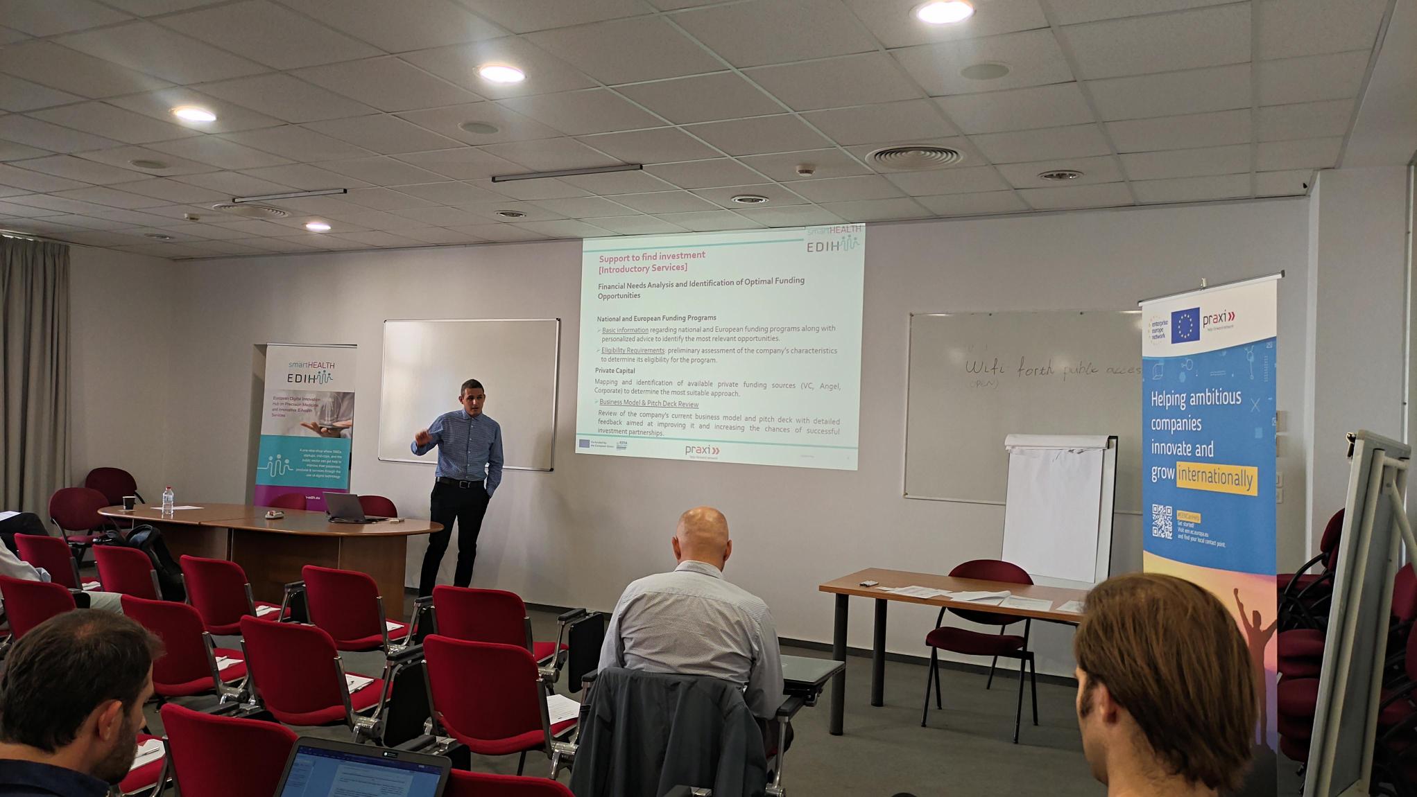 Ο Ηρακλής Καραντώνης, Σύμβουλος Μεταφοράς Τεχνολογίας στο Δίκτυο ΠΡΑΞΗ και συντονιστής της “Ομάδας Υποστήριξης Καινοτομίας ΜμΕ”, υπογράμμισε πώς το EDIH smartHEALTH μπορεί να παρέχει καθοδήγηση σε νεοφυείς εταιρίες start-ups, καινοτόμες ΜμΕ και άλλους οργανισμούς προκειμένου να διευκολύνει την πρόσβαση τους σε χρηματοδότηση, να προωθήσει την καινοτομία και να υποστηρίξει την ανάπτυξη των λύσεων τους.