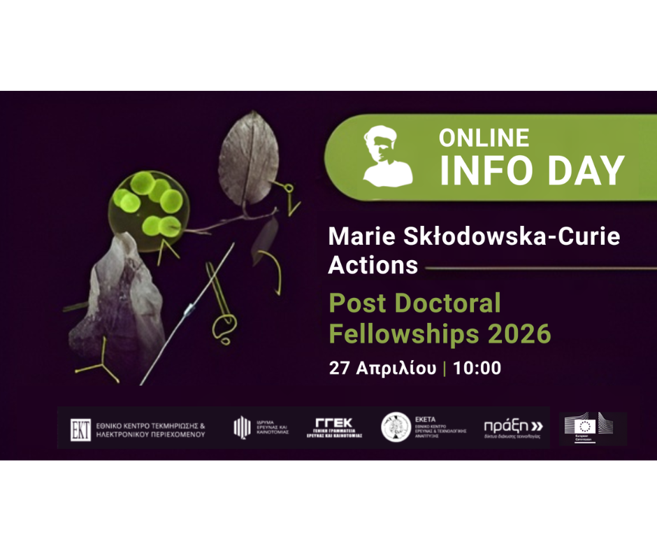 Το Δίκτυο ΠΡΑΞΗ, το Ίδρυμα Έρευνας και Καινοτομίας (ΙδΕΚ) της Κύπρου, το Εθνικό Κέντρο Έρευνας και Τεχνολογικής Ανάπτυξης (ΕΚΕΤΑ) και το Εθνικό Κέντρο Τεκμηρίωσης και Ηλεκτρονικού Περιεχομένου (EKT), διοργανώνουν Διαδικτυακή Ημερίδα Ενημέρωσης για τη δράση Post Doctoral Fellowships των Marie Skłodowska-Curie Actions του προγράμματος πλαισίου Ορίζοντας Ευρώπη, που θα πραγματοποιηθεί τη Δευτέρα 27 Απριλίου 2026 (10.00 -13.30).