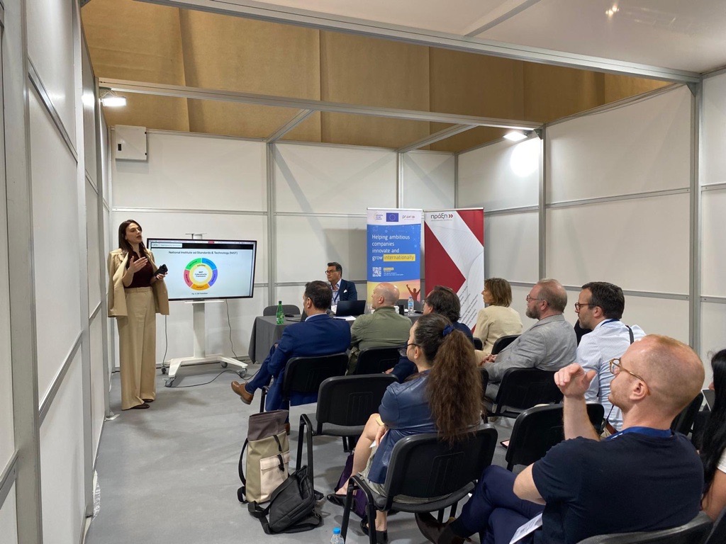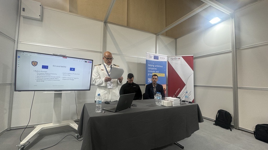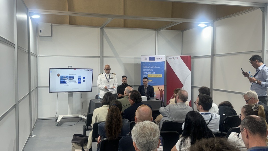 Η Anna Sibilla (EISMEA) και ο Γεώργιος Σταυρίτης, Project Manager της Ευρωπαϊκής Επιτροπής / DG DEFIS, παρουσίασαν τα διαθέσιμα εργαλεία στήριξης για τις επιχειρήσεις του τομέα, με έμφαση στις ευκαιρίες του European Defence Fund και τις ευρωπαϊκές πρωτοβουλίες που ενισχύουν τη συνεργασία, την καινοτομία και την ανταγωνιστικότητα.