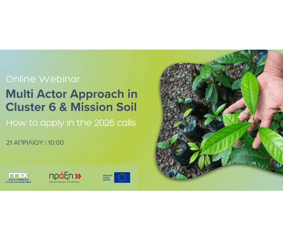Το Δίκτυο ΠΡΑΞΗ, Εθνικό Σημείο Επαφής για τις θεματικές Cluster 6-Food, Bioeconomy, Natural Resources, Agriculture and Environment και EU Missions, του προγράμματος «Ορίζοντας Ευρώπη» και το Enterprise Europe Network Hellas, συνδιοργανώνουν webinar με θέμα την εφαρμογή του Multi-Actor Approach (MAA) σε προτάσεις των προσκλήσεων του Cluster 6 και της αποστολής Mission Soil για το 2026.